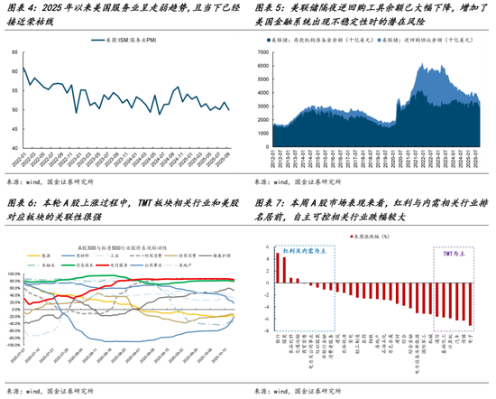 实际上,在地缘政治风险之外,本周市场的调整有着更深层次的原因。从基本面来看,一方面,当前美国服务业逐步走弱,2025年以来美国服务业PMI读数趋势走低,目前已回落到50的荣枯线上。另一方面,美国的金融环境可能也在面临着更大的不确定性:本周齐昂银行和西部联合银行均在财报中披露贷款欺诈事件使得公司计提大量减值损失;与此同时随着美联储缩表的推进,曾经作为美国金融体系流动性缓冲垫的联储逆回购工具余额已基本耗尽,且商业银行的保证金余额也略有下降,这也增加了美国金融系统面对冲击时的潜在风险。