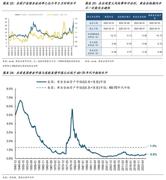 短期来看黄金可能确实面临着一些风险。当前市场参与者的交易情绪非常亢奋:沪金期权市场未来1个月期权合约隐含波动率自10月以来显著上升,目前已接近4月底的水平;而从偏度来看,投资者更倾向于给虚值看涨期权给予更高的波动率溢价。上述特征表明短期内黄金可能存在情绪过热以及交易过于拥挤的的隐忧。此外,在当前海外金融资产处于高位、金融体系存在不稳定性的情况下,重大风险事件出现可能会演变为流动性风险的冲击,因此在重大风险事件出现时黄金在短期内不一定能完全避险。从近年来重大风险事件(2020新冠冲击、2023硅谷银行破产、2024套息交易逆转、2025特朗普对等关税冲击)出现时资产价格的表现来看,黄金只在硅谷银行破产时实现了正收益。