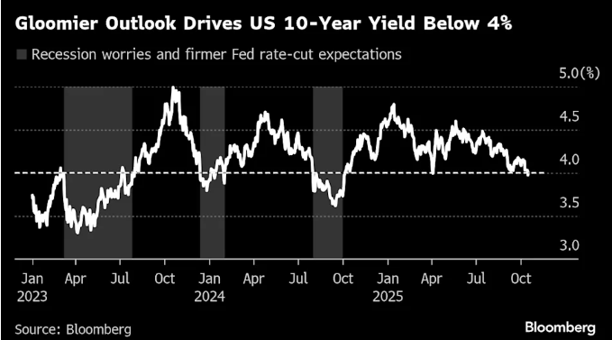 随着惊慌的投资者蜂拥买入国债避险,对利率政策敏感的两年期国债收益率上周一度跌破3.4%,创2022年以来新低;10年期美债收益率则创下四月以来最大跌幅,周中失守4%。而这已是本月以来美债避险买盘的第二轮涌入——更早前一周贸易紧张局势的重燃,曾引发过美债盘中出现更大幅度的上涨。