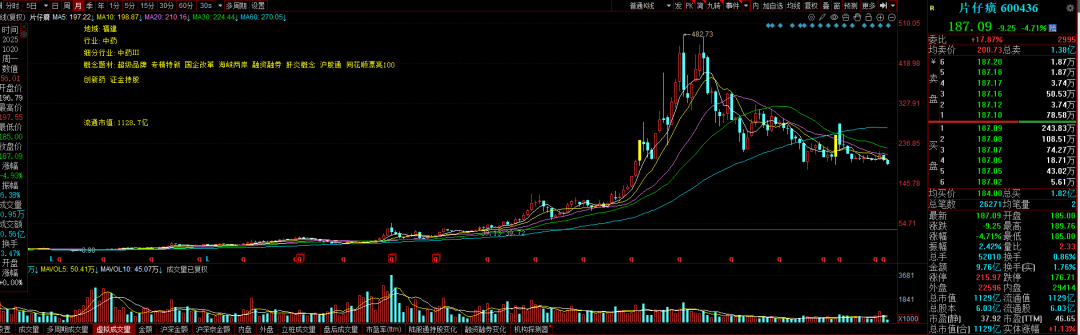 业绩下滑直接反映在股价上。2021年7月,片仔癀股价一度高达491.88元/股,市值接近3000亿元。而截至2025年10月20日收盘,其股价为187.09元/股,总市值1129亿元。