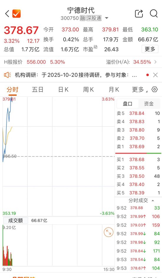 宁德时代AH股联袂上涨,截至发稿,宁德时代A股涨3.32%,报378.67元/股,宁德时代H股涨逾5%,报556港元/股。