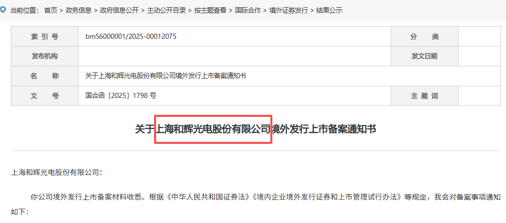2025年10月16日,中国证监会国际合作司发布关于上海和辉光电股份有限公司(以下简称和辉光电)境外发行上市备案通知书(国合函[2025]1798号)。
