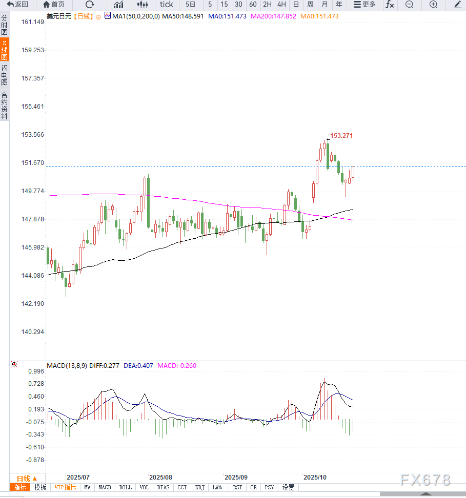 日线显示 USD/JPY 在近期回落后的反弹已突破 151.00 整数关口,并逐步逼近 151.75 区域,该区域同时对应近期下跌的 61.8%回撤位及 200 小时均线,构成重要阻力。