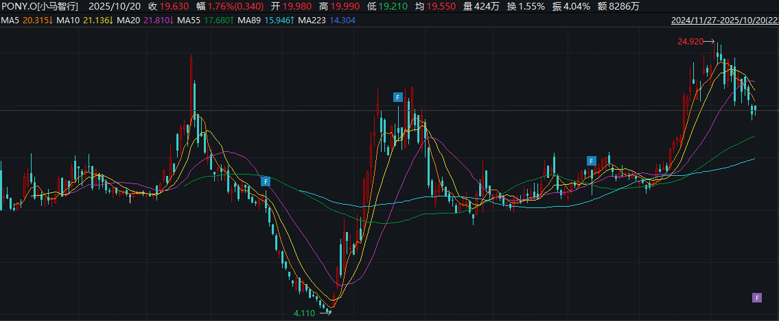 上市后的股价表现上演了截然相反的“过山车”行情。小马智行股价呈现先抑后扬的强劲反弹态势,2025年4月,公司股价一度触及4.11美元/ADR的低点,较IPO发行价暴跌68%,陷入上市后的估值低谷。但随着第七代Robotaxi的成功推出及商业化场景的逐步落地,公司技术转化能力获得市场认可,多家卖方机构纷纷给出买入评级,国际资本开始密集增持,股价随之开启持续回升通道。截至10月20日,小马智行收盘价攀升至19.63美元/ADR,较发行价上涨51%,对应的美股市值增至69.7亿美元,较低点实现翻倍增长。