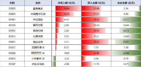 从资金具体流向观察,盈富基金获得19.94亿港元净买入,中国海洋石油和中芯国际分别获净买入14.25亿港元和6.42亿港元,成为最受资金青睐的标的。华虹半导体、小米集团-W等个股则遭遇不同程度净卖出。
