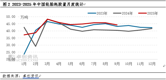 鉴于主要下游轮胎行业消费整体占天胶总消费近70%,因此卓创资讯统计月度天胶消耗量入下图所示,从图中可以看到2025年下游轮胎耗胶量较过去两年整体水平提升,核心原因在于中国轮胎出口韧性以及重卡、新能源汽车厂等稳步增长;同时企业新产能投放以及中国轮胎核心竞争力逐步抬升,天然橡胶需求端整体呈现上行趋势。