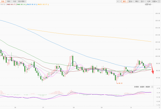 美元指数从110.18前期高点,一路开启承压回落的走势。目前整体价格跌破并运行在MA250下方,在触及96.37的低点后维持低位震荡,呈明显的空头趋势。日内短线行情则建议看空震荡下跌的走势。