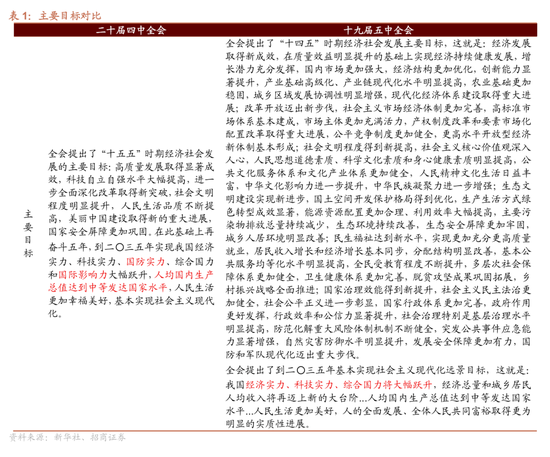 要点一:主要目标的两大变化。本次公报仍保留了 “人均国内生产总值达到中等发达国家水平”这一目标。此外,在远景目标中,相较于十九届五中全会公报提到的三大跃升,本次全会公报还增加了“国防实力”、“国际影响力”这两大跃升目标。