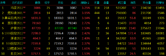 2025年10月24日,国内期货主力合约涨多跌少,燃油、集运欧线、鸡蛋涨超3%,国际铜涨近3%,沪铜、SC原油涨超2%。跌幅方面,红枣跌超4%,多晶硅跌超1%,螺纹跌近1%。