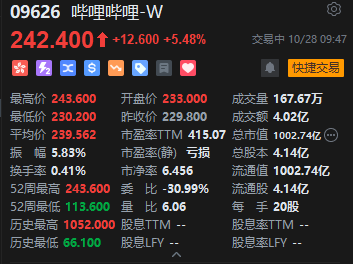 正文 哔哩哔哩港股盘初拉升涨超5%,创3年半以来新高 21资料 V管理员 /2025-10-28 10:30:24 /0 评论 /4 阅读 1028 哔哩哔哩港股盘初拉升涨超5%,创3年半以来新高;美股夜盘拉升涨近4%。 消息面上,公司发行的单机游戏《逃离鸭科夫》仅一周销量突破百万。国信证券研报指出,游戏市场8月收入环比增长0.6%,持续看好政策、景气度与AI应用驱动下的板块机会。