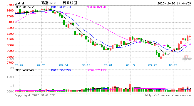 近期鸡蛋期现价格强势上涨,核心在于短期抄底行为与市场情绪共振引发的超跌反弹。从基本面看,当前在产蛋鸡存栏量处于高位,鲜蛋供给整体充裕,叠加上半年积压的冷库蛋持续释放,供给端压力显著;需求端则处于国庆后的传统淡季,消费整体偏弱。供给宽松而需求疲软的格局,成为压制蛋价上行的主要压力。