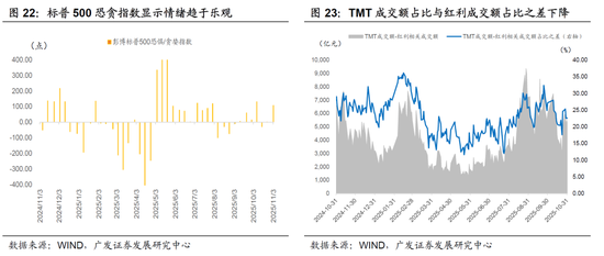 观察市场的广谱性。在“价”上“市场宽度”连续两周走平,万得全A指数成分股中各成分股超越股票自身240日均线的占比维持在73.5%左右;超60日、20日均线占比同样维持在47.10%%、56.5%。在“量”上,市场集中度一波三折,A股成交额前5%的个股成交额占全部A股比重小幅回升至42.9%,但仍低于9月极致状态。