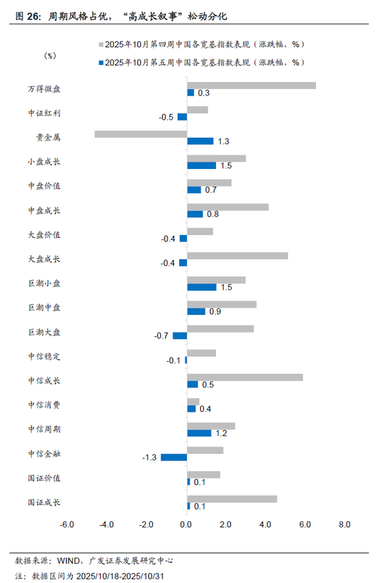 第二,10月最后一周全球资产叙事交易松动,“现实”重回定价主线。全球股市分化,美股隐忧初显,金铜告别单边,原油回归供需,美元连续反弹。日本资产仍相对独立,高市交易下日元贬至新低。中国资产赔率发挥定价权,集中度下降、“高成长叙事”分化,周期风格占优,电力设备、有色、钢铁领涨。