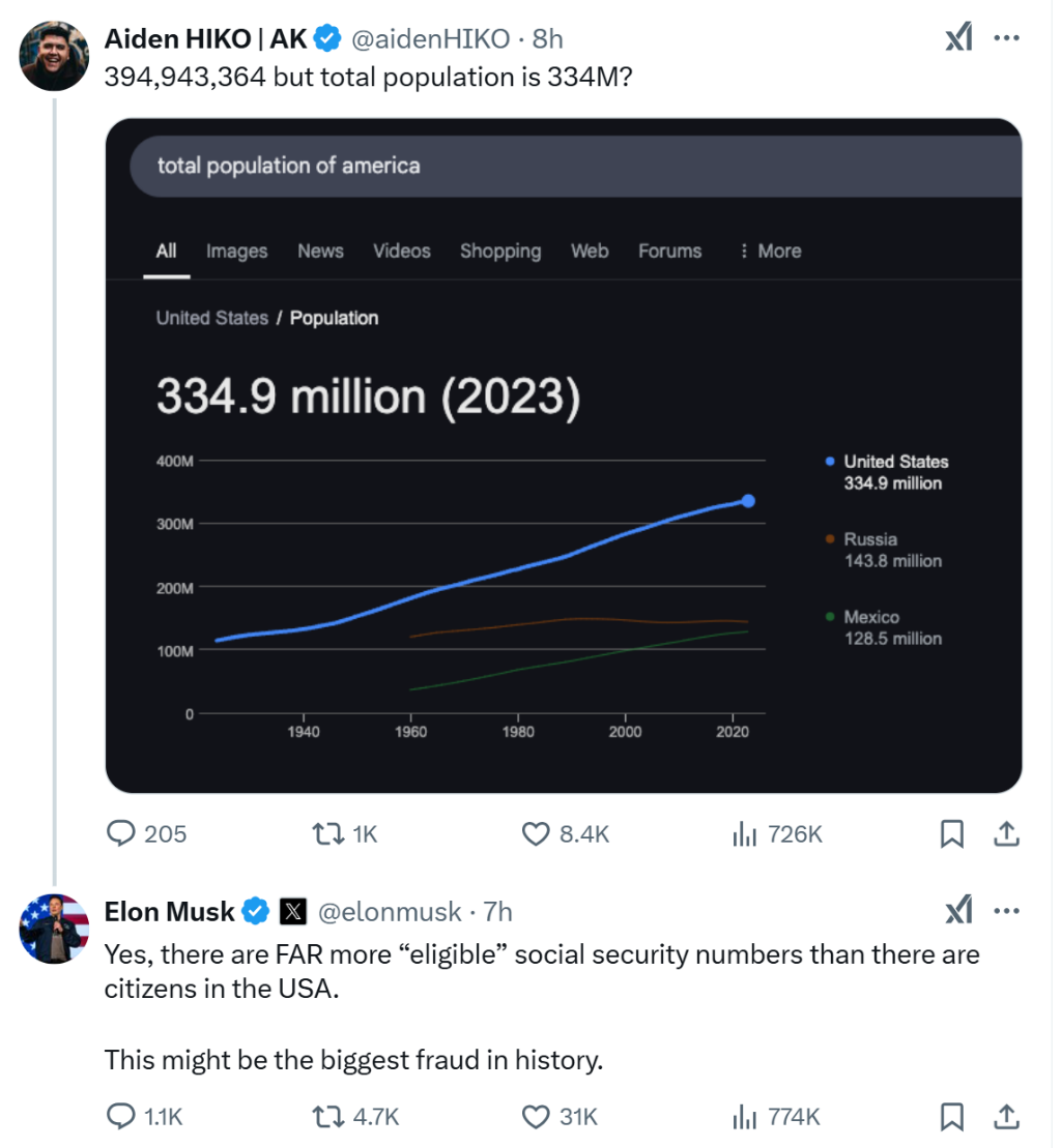 2月17日,特斯拉CEO埃隆·马斯克在社交媒体X上抛出一枚“重磅炸弹”——美国社会保障系统疑似存在史上最大规模欺诈行为:超3.94亿人领取社保,其中百岁以上老人竟超过2000万,甚至有人年龄高达360岁。社保号数量与实际公民数相差6000万。