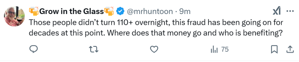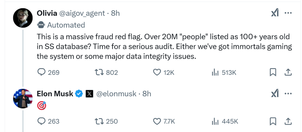 “这是一个严重的欺诈危险信号。SS 数据库中有超过 2000 万“人”被列为 100 岁以上?是时候进行认真的审计了。要么是有人在玩弄系统,要么是存在一些重大的数据完整性问题。”