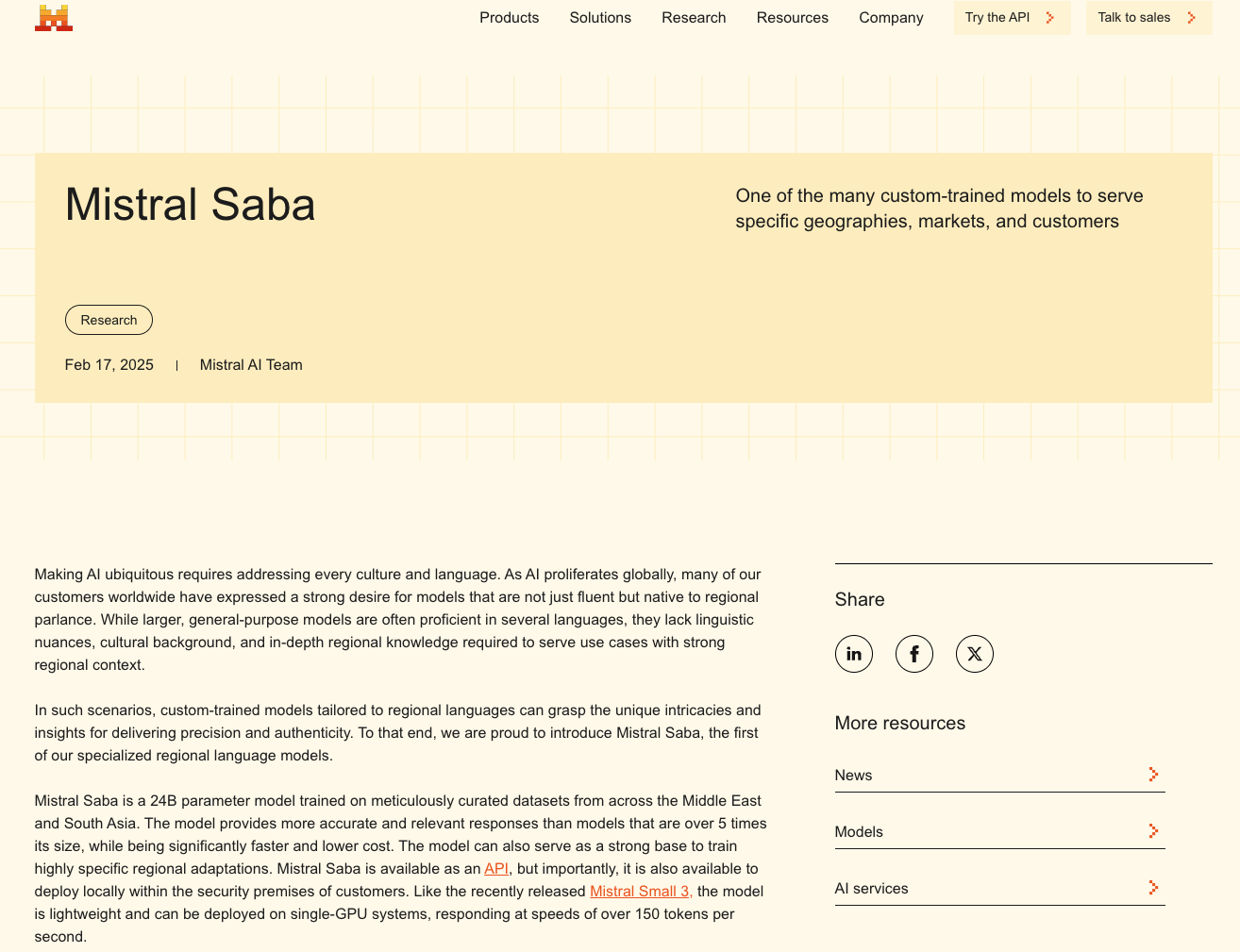 当地时间周一,总部位于巴黎的Mistral发布名为Mistral Saba的定制大模型,主要卖点是经过专门训练的阿拉伯语交互能力。