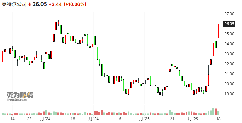 周二(2月18日)美股早盘,美国芯片制造商英特尔的股价一度涨超11%,最高报每股26.25美元,为2024年11月12日以来的最高水平。