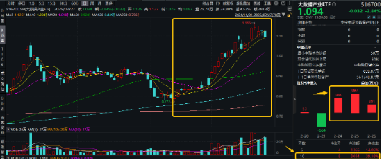 热门ETF方面,被动跟踪中证数据指数的大数据产业ETF(516700)全天在水面下震荡,场内价格收跌2.84%。值得注意的是,大数据产业ETF(516700)自本轮低点(1月13日)以来,累计上涨38.83%,日k线或已走出漂亮的“上行台阶”。