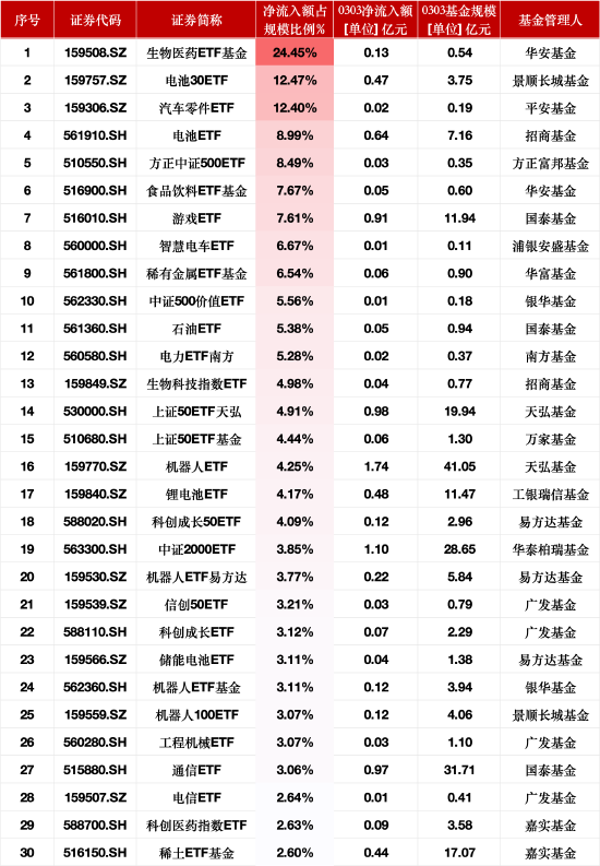 正文 3月3日ETF资金流入榜单:生物医药ETF基金净流入额占比增24.45%,电池30ETF占比增12.47% 21资料 V管理员 /2025-03-04 10:20:03 /0 评论 /21 阅读 0304 专题:新浪仓石基金研究院 Wind数据显示,3月3日,华安生物医药ETF基金获净申购0.13亿元,当月资金净流入额占规模比例为24.45%,增幅位居股票ETF第一名; 景顺长城电池30ETF获净申购0.47亿元,当月资金净流入额占规模比例为12.47%,增幅位居股票ETF第二名; 平安汽车零件ETF获净申购0.02亿元,当月资金净流入额占规模比例为12.40%,增幅位居股票ETF第三名。