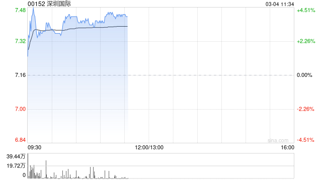 深圳国际(00152)发盈喜后涨超4%,截至发稿,股价上涨3.35%,现报7.40港元,成交额1988.37万港元。