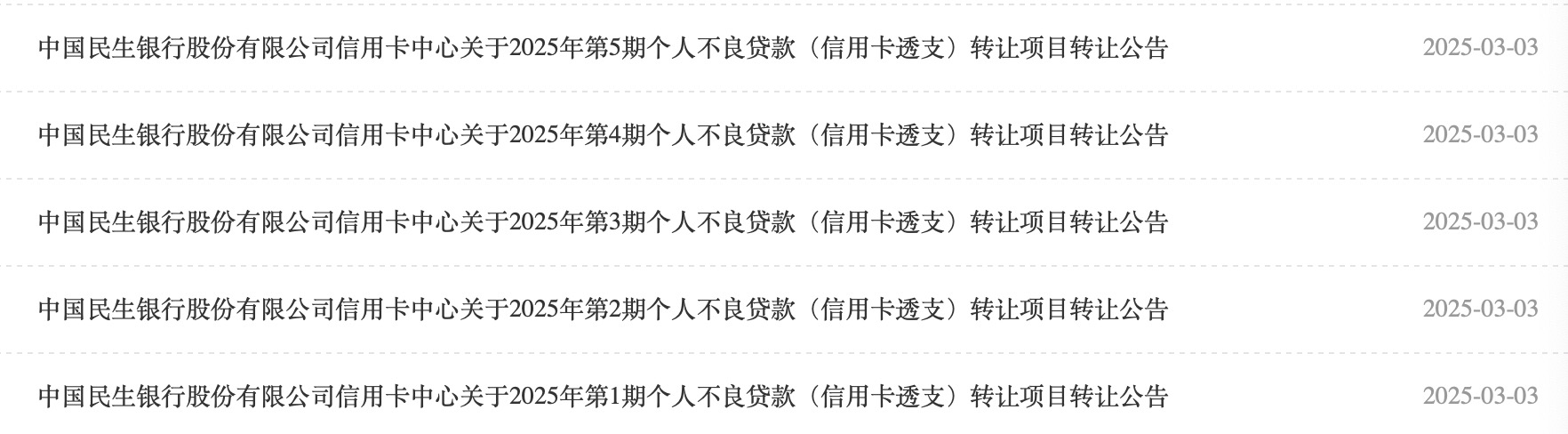 3月3日,民生银行信用卡中心在银行业信贷资产登记流转中心(简称“银登中心”)上架了2025年首批个人不良贷款转让项目,5个资产包均涉及信用卡透支,合计未偿本息总额超过6亿元。