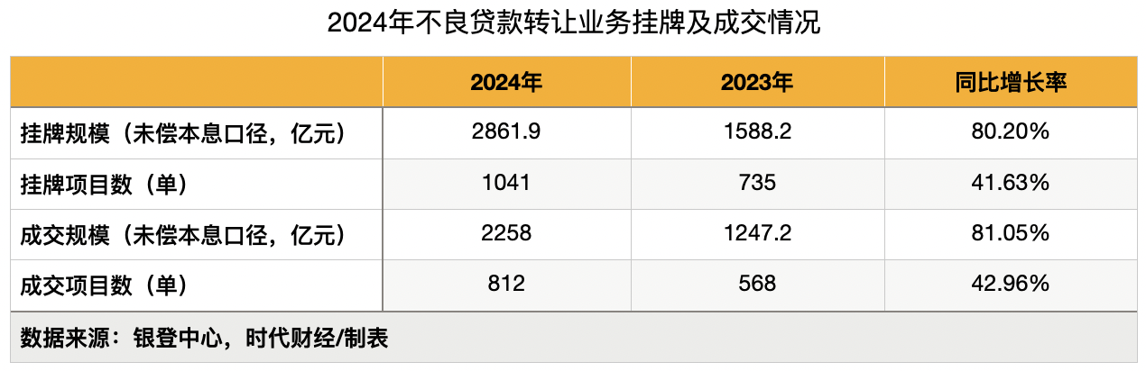 上述《报告》数据显示,从挂牌情况来看,2024年全年,不良贷款转让业务的未偿本息规模合计达2861.9亿元,较2023年的1588.2亿元同比增长80.2%;挂牌项目数为1041单,较2023年的735单同比增长41.63%。