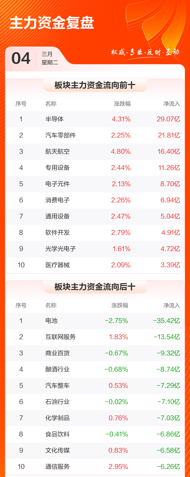 数据显示,今日大盘主力资金净流出69.46亿。半导体、汽车零部件、航天航空等板块主力资金流入排名居前,其中半导体净流入29.07亿元。