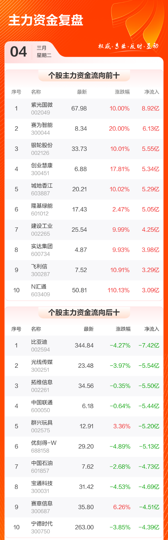 主力复盘:8.92亿流入紫光国微7.42亿流出比亚迪