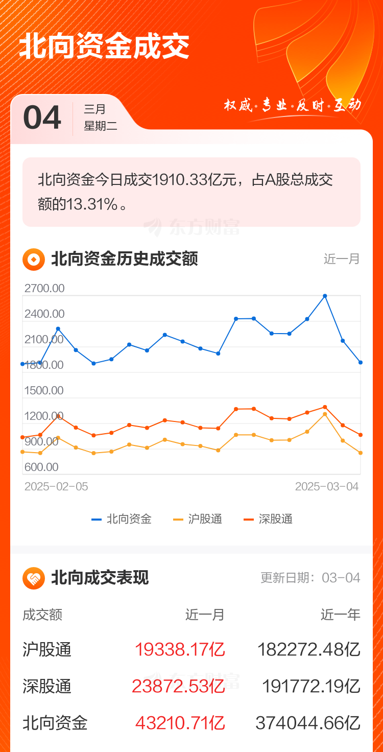 交易所最新数据显示,3月4日北向资金共成交1910.33亿元,占两市总成交额的13.31%。