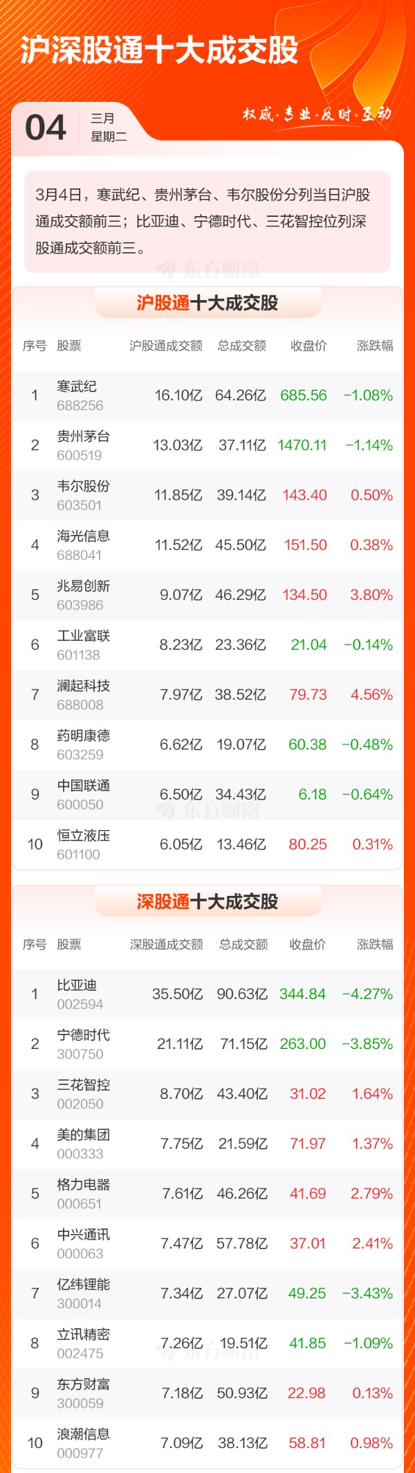 寒武纪、贵州茅台、韦尔股份位列沪股通成交前三,成交额分别为16.10亿、13.03亿、11.85亿;比亚迪、宁德时代、三花智控位列深股通成交前三,成交额分别为35.50亿、21.11亿、8.70亿。