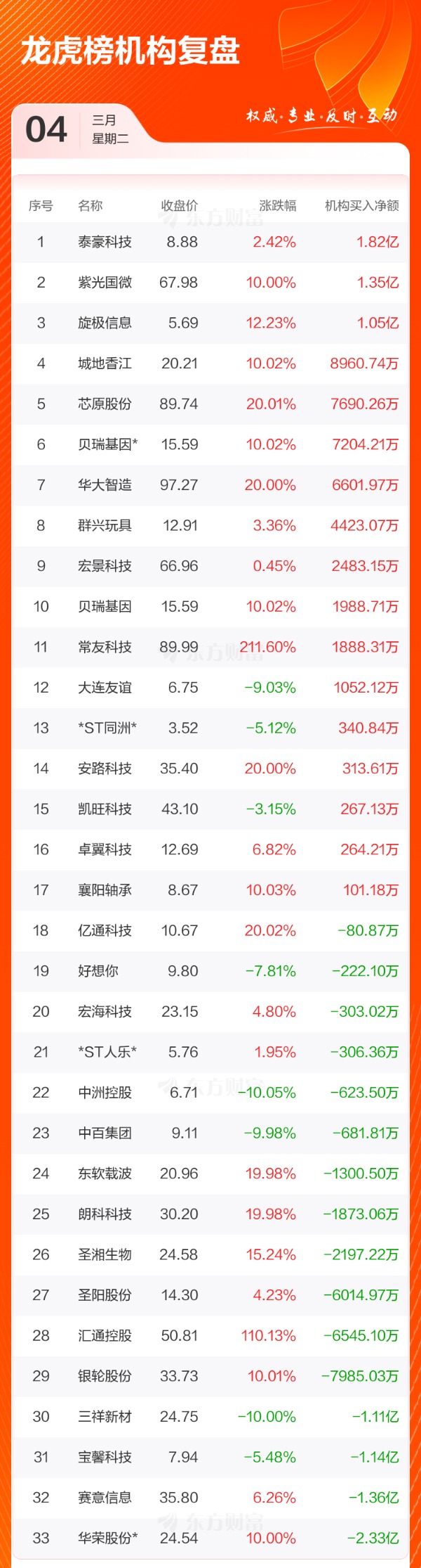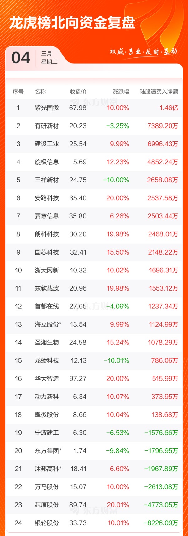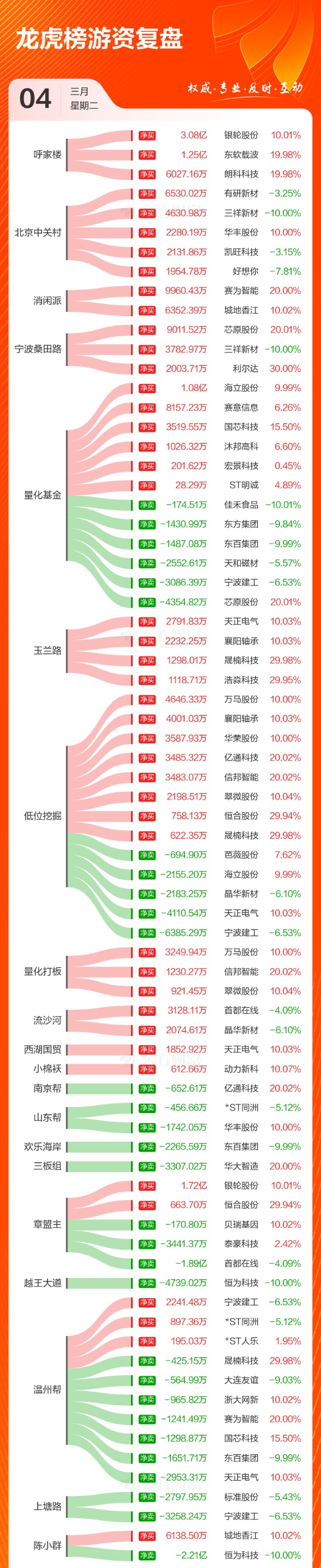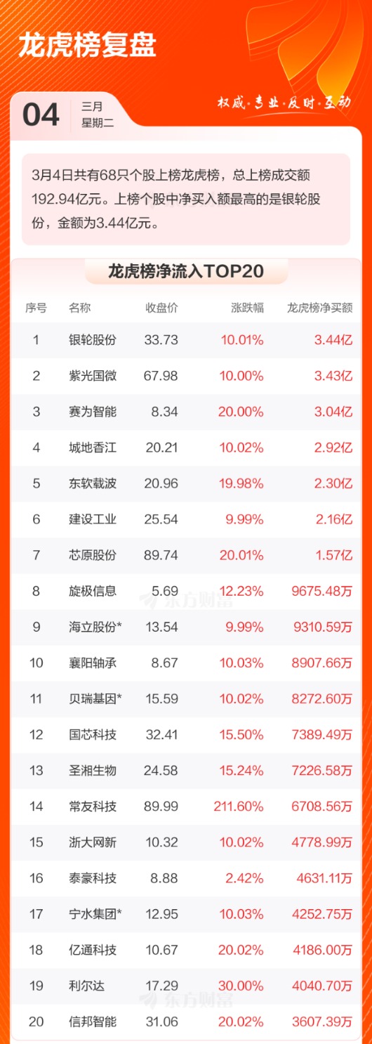 3月4日共有68只个股上榜龙虎榜,总上榜成交额192.94亿元。上榜个股中净买入额最高的是银轮股份,金额为3.44亿元。