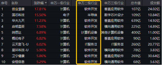 今日(3月4日),AI应用端再走强,带动软件开发行业集体狂欢!中证信创指数涨幅前10大成份股中,软件开发行业个股占7席,其中,AI医疗概念股创业慧康涨逾17%、卫宁健康涨超5%,此外,华大九天涨超11%,启明星辰涨逾7%,概伦电子、星环科技-U等个股大幅跟涨。