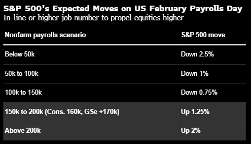 该团队预计,如果2月份的月度就业人数增长超过15万,该基准股指将上涨多达2%。该行预计非农就业人数将增加17万人,而接受调查的经济学家预测中值为16万人。