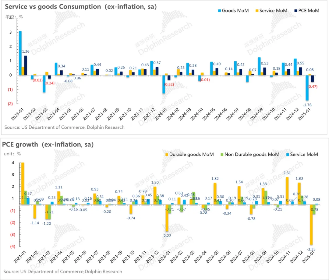 按剔通胀的季调年化数,美国1月居民消费支出(PCE)出现了0.47%的环比负增长;其中,a.服务项目上的消费支出增长走弱了,增长仅0.08%;b. 商品消费环比大跌1.76%,主要是由耐用商品和非耐用商品环比都是下跌的,其中耐用品跌幅更大——环比掉了3.35%。