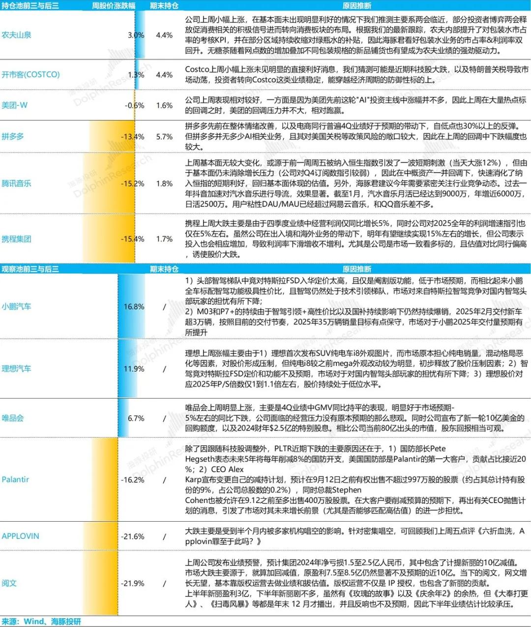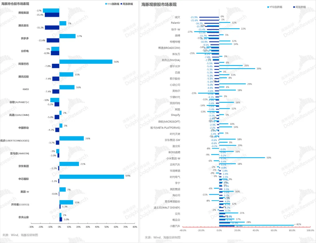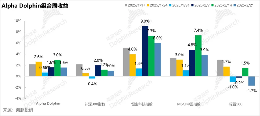 上周Alpha Dolphin无调仓。Alpha Dolphin组合上周收益-3.7%,跑输沪深300 -2.2%、标普500(-1%),但跑赢了MSCI中国(-4.3%),以及恒生科技(-5%)。