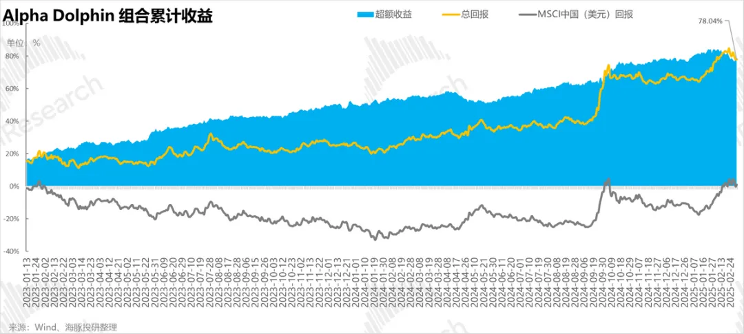 自组合开始测试(2022年3月25日)到上周末,组合绝对收益是78%,与 MSCI 中国相比的超额收益是77%。从资产净值角度来看,海豚君初始虚拟资产1亿美金,截至上周末超过了1.8亿美金。