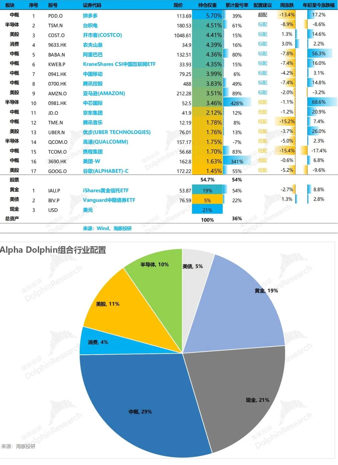 Alpha Dolphin虚拟组合共计持仓17只个股与权益型ETF,其中标配8只,超配1只,其余低配。古钱之外资产主要分布在了黄金、美债和美元现金上。
