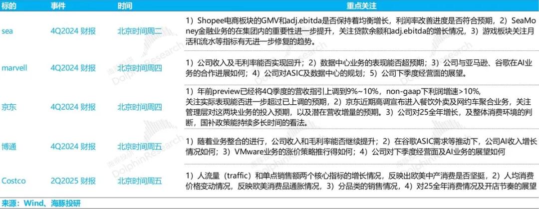 本周美股财报季尾声,两个ASIC算力公司,Marvell和博通发布业绩;中概公司缓慢进入财报季,本周主要是京东和SEA。