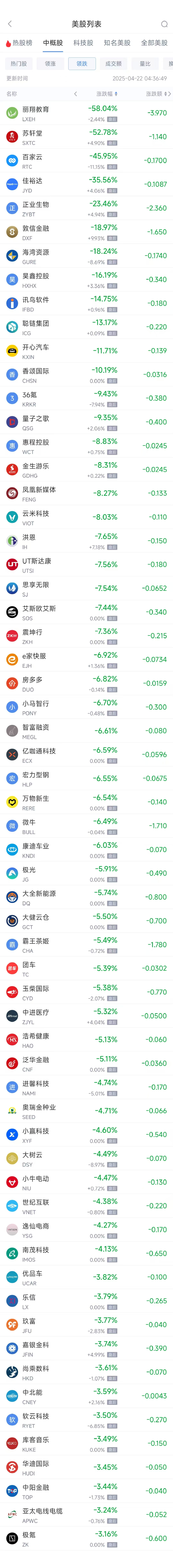 领跌中概股列表: