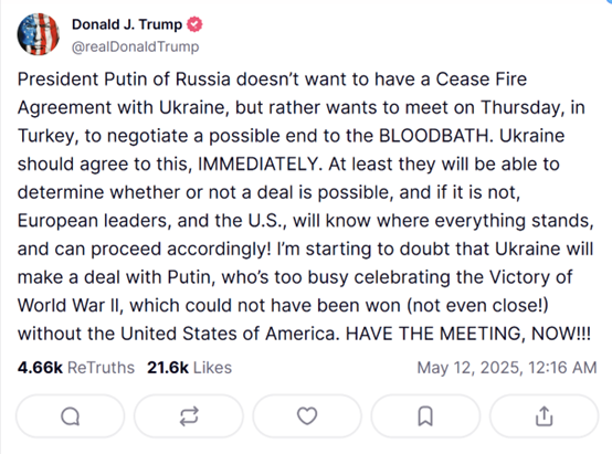 “俄罗斯总统普京并不想与乌克兰达成停火协议,而是希望于周四在土耳其会面,就结束这场冲突的可能性进行谈判。乌克兰应该立即同意这一点。至少他们将能够判断是否有可能达成协议,而且如果无法达成协议,欧洲领导人以及美国也会清楚形势究竟如何,并能够据此采取行动!特朗普周日在Truth Social上写道。