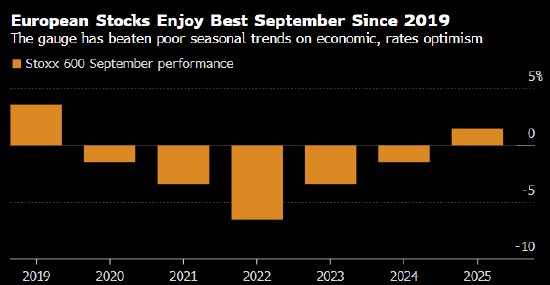 欧洲股市周二收涨,以2019年以来最佳同期表现为九月画上句号,因围绕美国经济增长韧性及利率下行的乐观情绪提振市场风险偏好。
