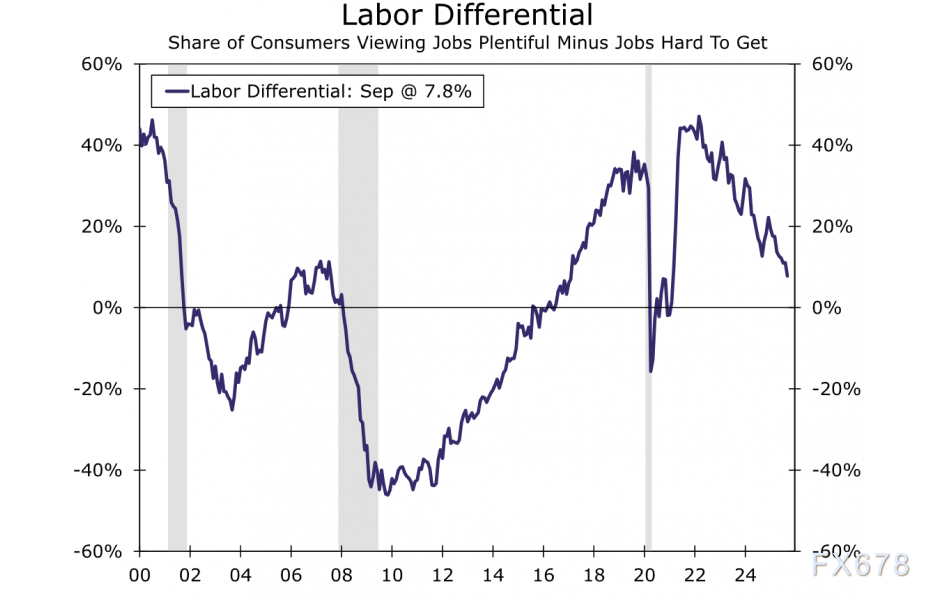 汇通财经APP讯——美国当前经济图景呈现“软数据”(信心)与“硬数据”(实际支出)的显著分化。透过就业差指数这一透镜可观察到消费者真实心态,其下行趋势明确指向劳动力市场动能衰退——这正是信心疲软的核心根源,也是未来政策效果与消费走势的关键变量。