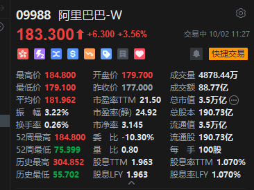 10月2日消息,阿里巴巴(9988.HK)盘中一度涨超4%,报184.8港元,股价创2021年8月以来新高,阿里巴巴年内已累涨超125%。截至发文,阿里巴巴涨3.56%,报价183.3港元,成交额逾88亿港元。