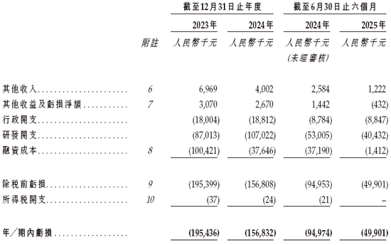 招股书显示,在过去的2023年、2024年和2025年前六个月,麦科奥特的未有营业收入,相应期间的研发开支分别为人民币0.87亿、1.07亿和0.40亿元,相应期间的净亏损分别为人民币1.95亿、1.57亿和0.50亿元。