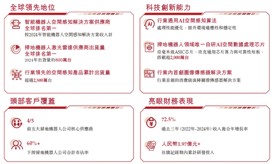 根据灼识咨询的资料,于2024年按收入计,欢创科技在全球扫地机器人空间感知解决方案领域排名第一。于2024年收入及出货量方面在扫地机器人激光雷达产品领域维持领先地位,出货量约为800万台,按出货量计的市场份额超过50%。自成立以来,累计出货量合共超过2,500万台。于2025年上半年继续稳健增长,激光雷达及线激光传感器总出货量分别超过500万台及200万台。