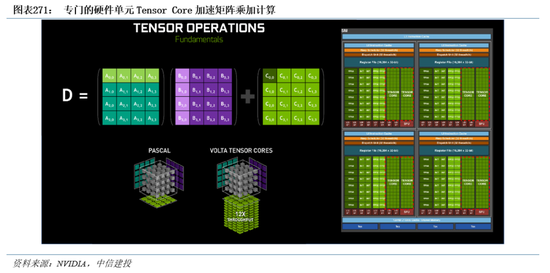 GPU引入特殊硬件单元加速AI的核心运算环节。矩阵-矩阵乘法(GEMM)运算是神经网络训练和推理的核心,本质是在网络互连层中将大矩阵输入数据和权重相乘。矩阵乘积的求解过程需要大量的乘积累加操作,而FMA(Fused Multiply–Accumulate operation,融合乘加)可以消耗更少的时钟周期来完成这一过程。传统CUDA Core执行FMA指令,硬件层面需要将数据按寄存器->ALU->寄存器->ALU->寄存器的方式来回搬运。2017年发布的Volta架构首度引入了Tensor Core(张量核心),即NVIDIA研发的新型处理核心。根据NVIDIA数据,Volta Tensor Core可以在一个GPU时钟周期内执行4×4×4=64次FMA操作,吞吐量是Pascal架构下CUDA Core的12倍。