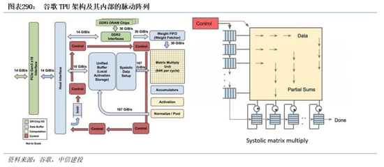 以谷歌TPU及计算核心结构脉动阵列为例,对比其相较于CPU、GPU的区别: