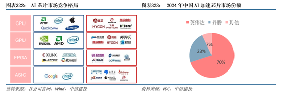 CPU+XPU的异构方案成为大算力场景标配,GPU为应用最广泛的AI芯片。目前业内广泛认同的AI芯片类型包括GPU、FPGA、NPU等。由于CPU负责对计算机的硬件资源进行控制调配,也要负责操作系统的运行,在现代计算系统中仍不可或缺。GPU、FPGA等芯片都是作为CPU的加速器而存在,因此目前主流的AI计算系统均为CPU+XPU的异构并行。CPU+GPU是目前最流行的异构计算系统,在HPC、图形图像处理以及AI训练/推理等场景为主流选择。根据中国信通院《先进计算蓝皮书》,2024年,搭载GPU的AI服务器占比约为71%,其中英伟达的市场占有率接近90%,AMD约为8%;随着全球领先的云服务商不断加大对自研芯片的应用力度,非GPU的AI芯片市场规模显著增长,其中ASIC芯片在AI服务器中的占比已攀升至26%。