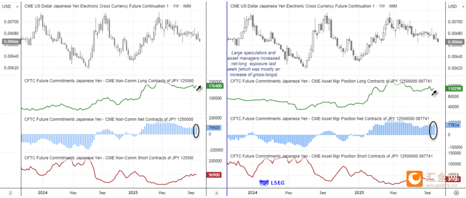 最新发布的交易员持仓报告显示,提前布局的多头遭遇了意外打击。截至周二,大型投机者与资产管理机构的净多头头寸当周合计增加2.56万手。其中新增多头仓位占据主导:大型投机者的日元多头总持仓增长9%,资产管理机构增长8%,合计新增2.25万手多头合约。大型投机者同时还削减了3.5%的空头总持仓(减少3600手)。