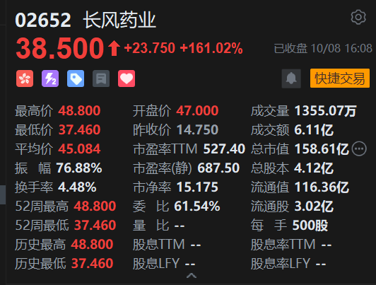 长风药业上市首日涨超160%。公开发售阶段长风药业获约6697.8倍超额认购,共接获近26.42万份有效申请。由于认购倍数极高,公开发售股份最终数目增至412万股,占全球发售股份总数的约10%。申购一手的投资者获配发股份的几率极低,中签率仅为1%。国际配售部分同样获得超额认购,倍数约为12.74倍。